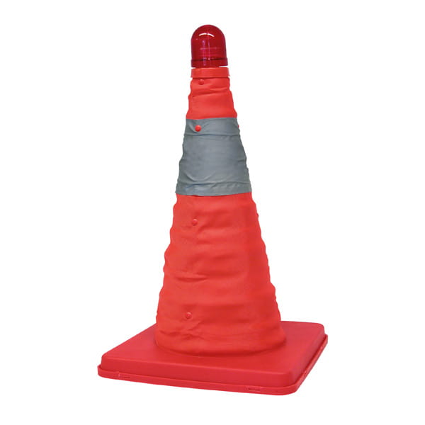 Dobrze widoczny odblaskowy pachołek bezpieczeństwa. Wyposażony został w srebrny odblaskowy pas oraz migające diody LED na górze pachołka.
