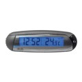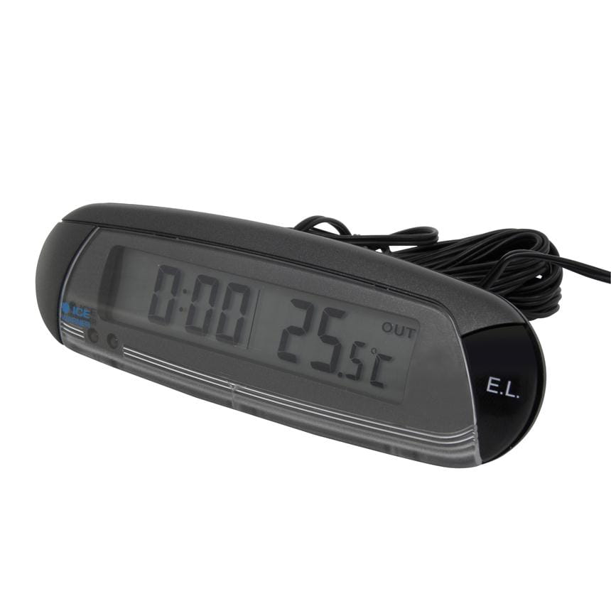 Termometr został wyposażony w czujnik temperatury panującej wewnątrz samochodu oraz czujnik zewnętrzny. Termometr na wyświetlaczu zawsze pokazuje aktualna godzinę oraz temperaturę wewnętrzną lub zewnętrzną - ustawia się to przełącznikiem znajdującym się po lewej stronie urządzenia ("in" - wewnątrz, "out" - na zewnątrz). Termometr posiada czujnik oblodzeniowy, gdy temperatura spadnie poniżej 0 stopni celsjusza włączy się alarm oraz zaświecą się diody znajdujące się w dolnym lewym rogu. Po prawej stronie znajduje się przycisk włączający podświetlenie (na około 3 sekundy). Czujnik zewnętrzny (dzięki któremu możemy odczytywać temperaturę panującą na zewnątrz pojazdu) należy zamontować taśmą dwustronną (taśma w zestawie) lub wkrętami w miejscu nie narażonym na działanie wody i soli. Długość kabla czujnika to 3m.